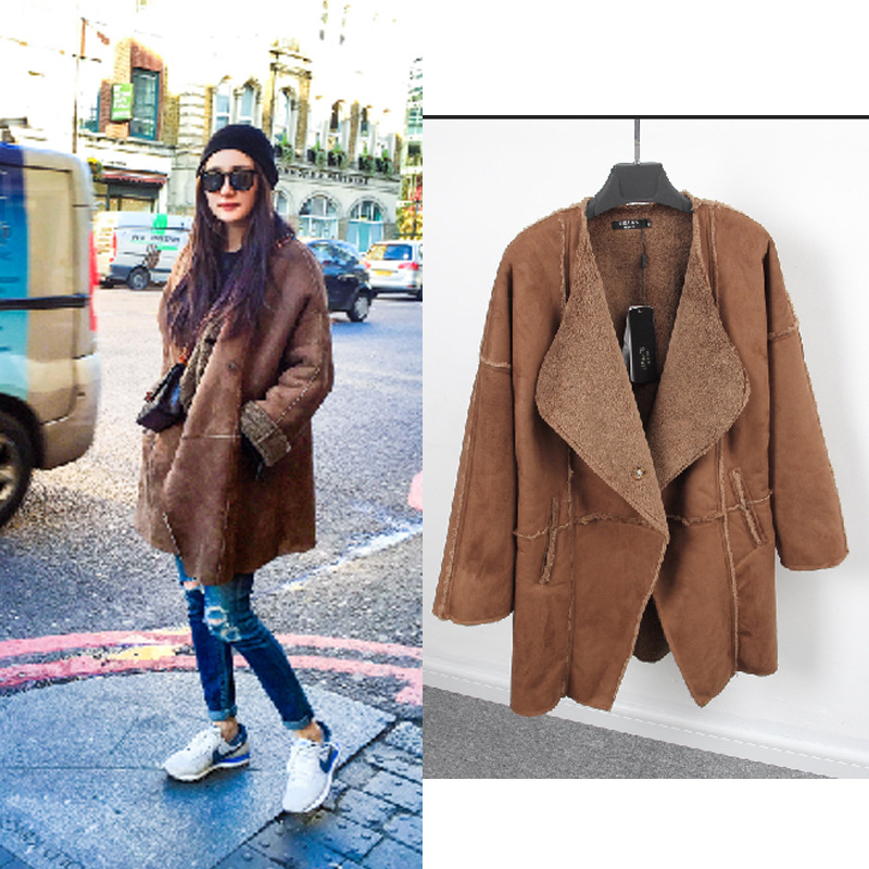 歐洲站冬裝明星同款楊冪機場街拍大翻領皮毛一體大衣外套現(xiàn)貨 /