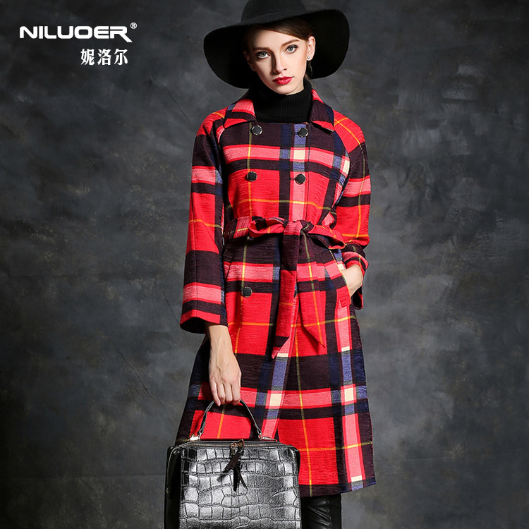 2015歐美優(yōu)雅格紋中長款氣質(zhì)百搭雙排扣修身款寬松大衣格子風(fēng)衣 /