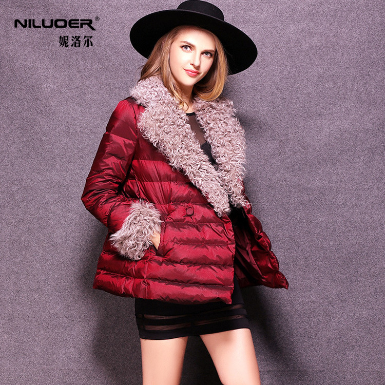 歐洲站2015冬裝新款毛領(lǐng)羊卷毛加厚A字斗篷羽絨棉服外套女 /