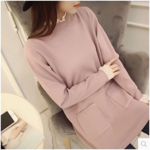 針織衫女秋冬新款韓版時(shí)尚修身簡(jiǎn)約蕾絲拼接中長(zhǎng)款套頭毛衣上衣女 /