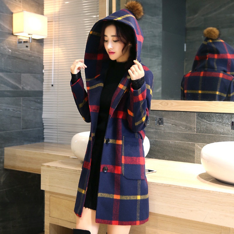 格子毛呢外套2015秋冬裝韓版中長(zhǎng)款時(shí)尚修身收腰冬裝帶帽呢大衣女 /