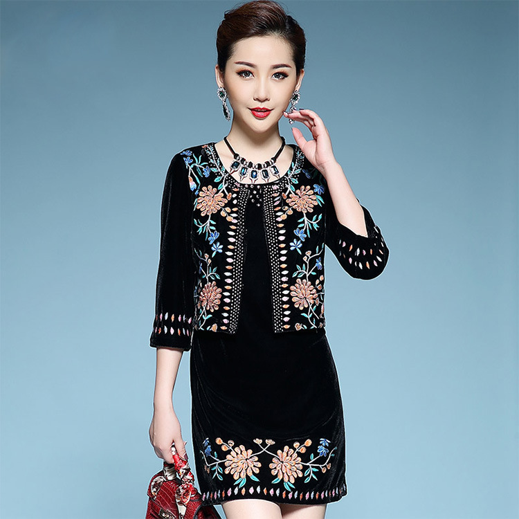 2015秋款中老年女裝民族風(fēng)刺繡高端金絲絨時尚連衣裙套裝2件套 /