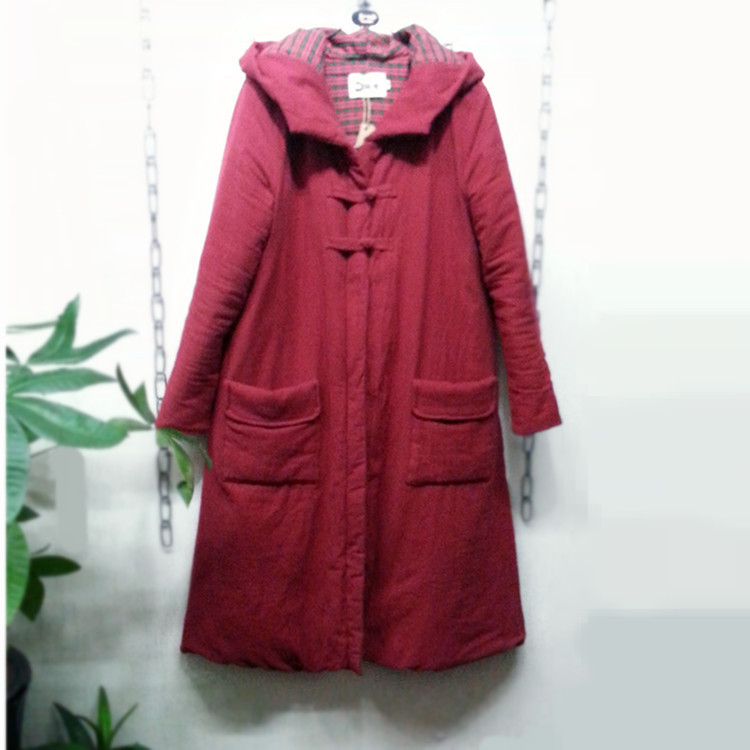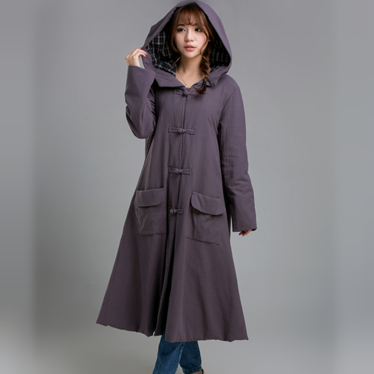 工廠批發(fā)冬季棉麻女裝夾棉長袍 手工盤扣文藝復(fù)古A字背帽棉大衣 /
