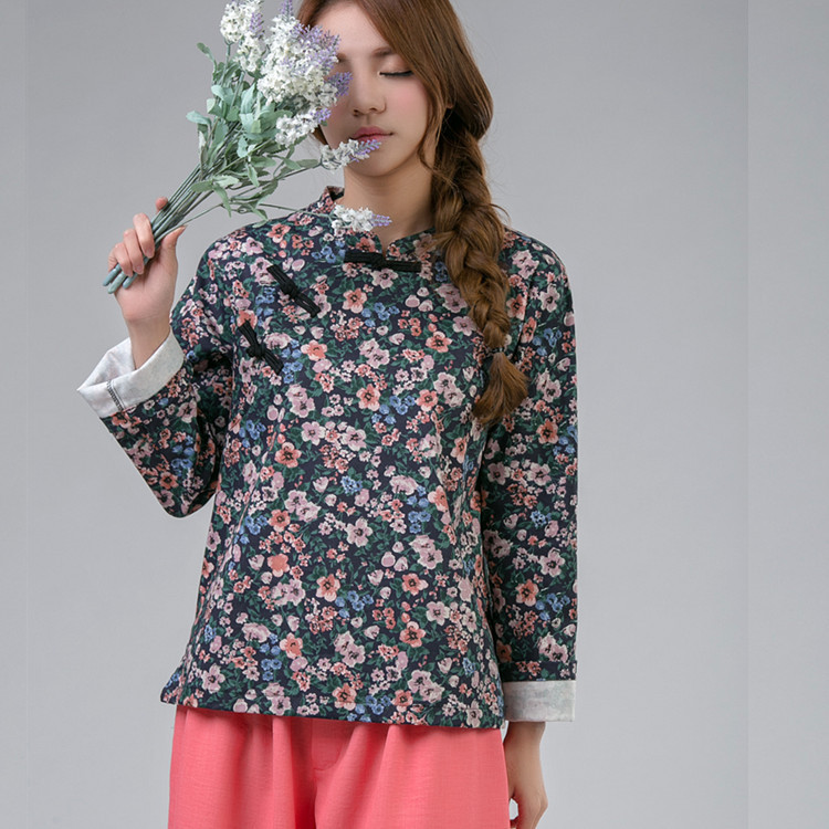 2016春裝文藝范短上衣 全棉碎花寬松套頭復(fù)古盤扣體恤 立領(lǐng)小衫 /