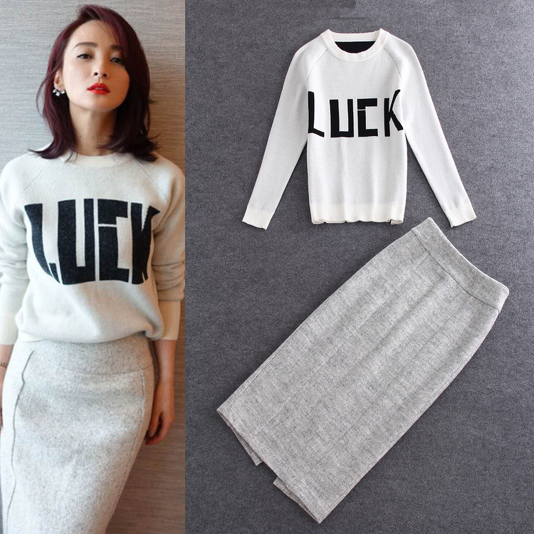 明星同款 2015秋冬新品女裝 毛織套頭彈力上衣+包臀半裙兩件套裝 /