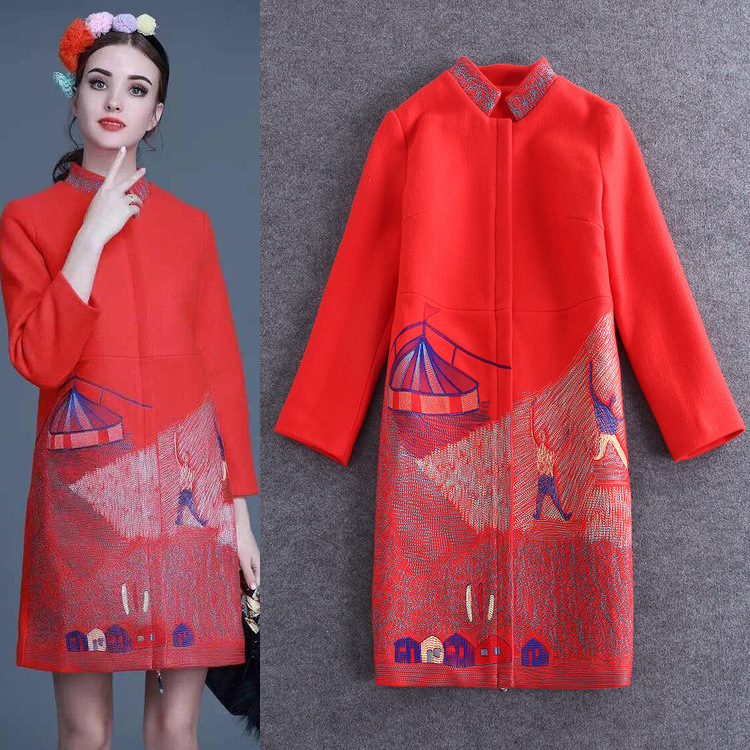 2015歐美秋冬新款女裝重工草原刺繡立領(lǐng)廓形氣質(zhì)毛呢外套大衣女 /