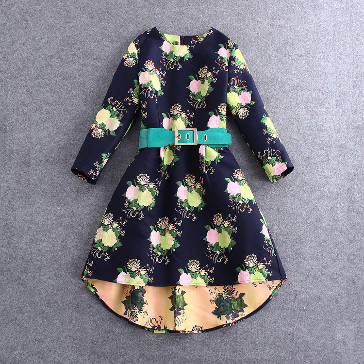 歐美大牌 2015秋冬新款女裝 時(shí)尚氣質(zhì)印花修身圓領(lǐng)大擺連衣裙 /