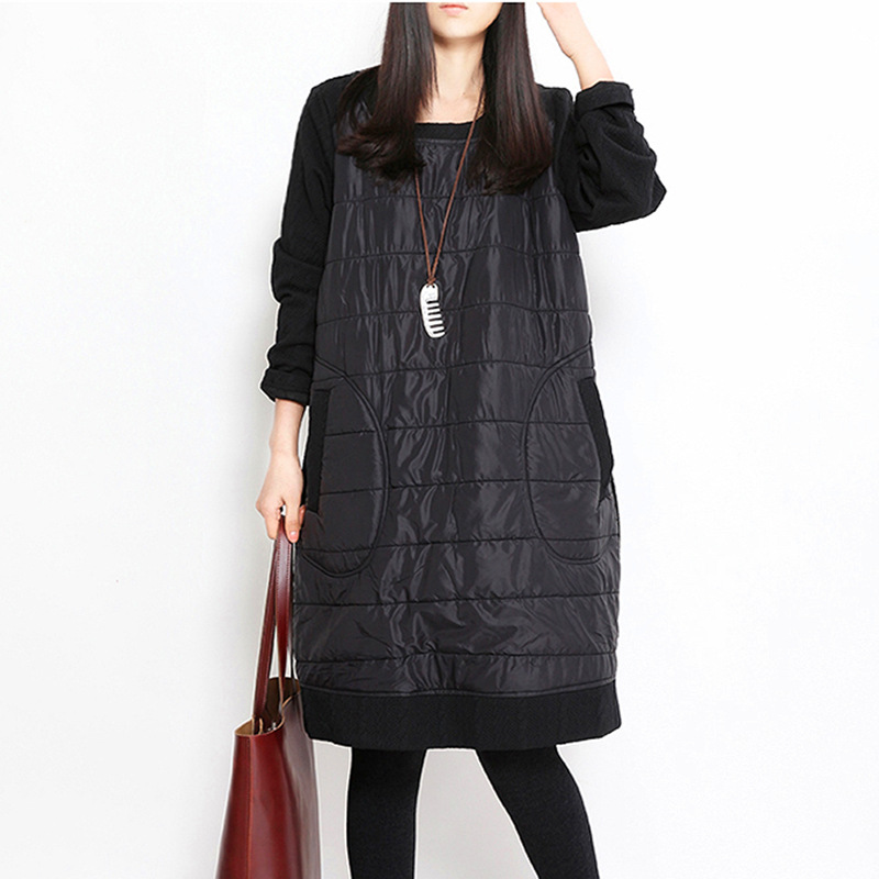 2015秋冬新款韓版大碼女裝圓領(lǐng)夾棉拼接加厚長袖連衣裙 /