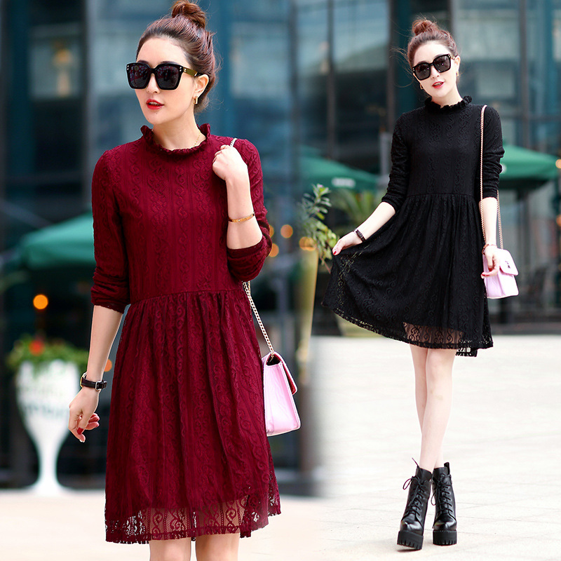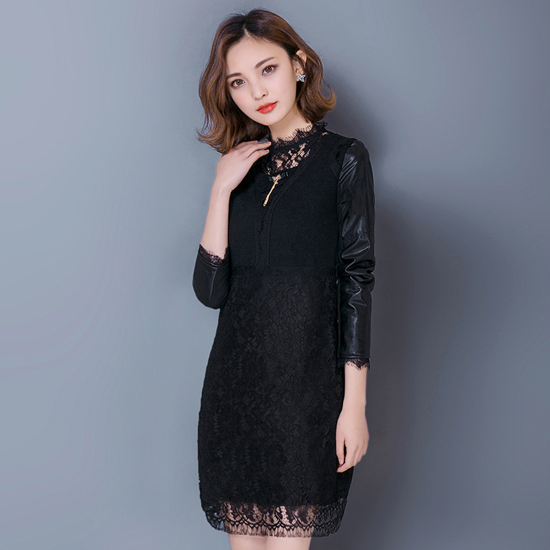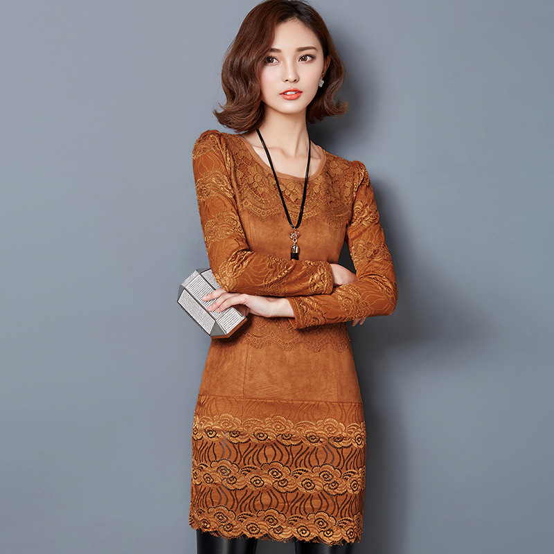 2015秋冬新款韓版加絨保暖連衣裙長袖氣質(zhì)蕾絲打底裙女潮 /