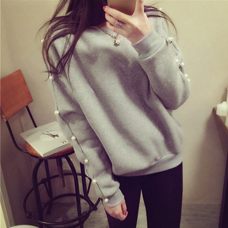 2015秋裝新款韓版女裝全手工訂珍珠加絨加厚套頭長袖衛(wèi)衣上衣批發(fā) /