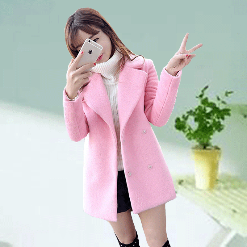 韓版粉色秋冬毛呢外套女裝2015新款中長款呢子加厚繭型毛呢大衣潮 /