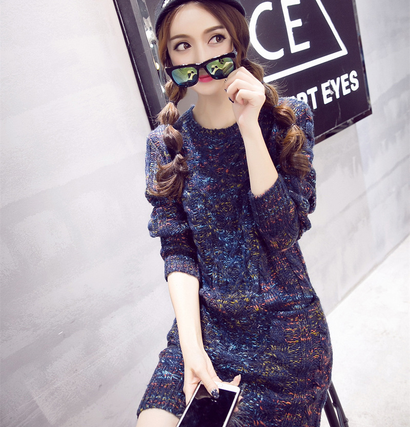 2015秋冬季新款實拍韓版時尚新款外穿毛衣拼色連衣裙短裙口袋 /