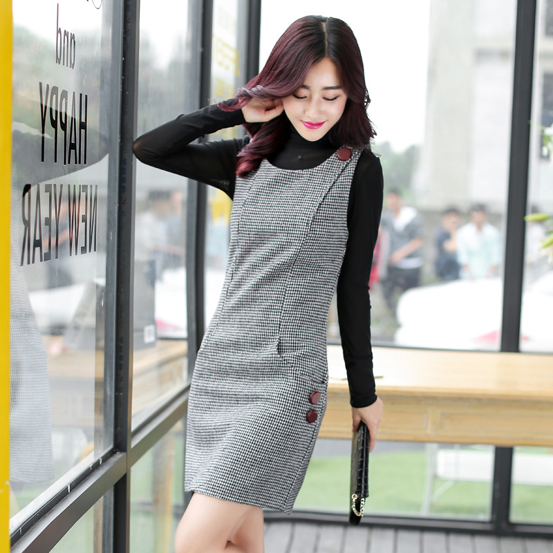 背心裙 千鳥(niǎo)格無(wú)袖背心裙連衣裙女毛呢秋冬款馬甲裙毛尼打底裙子 /