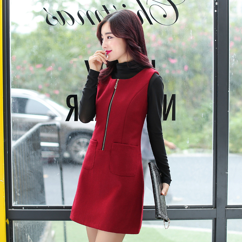 2015秋冬款女裝新款中長(zhǎng)款毛呢背心裙冬裙厚冬季無(wú)袖馬甲連衣裙子 /