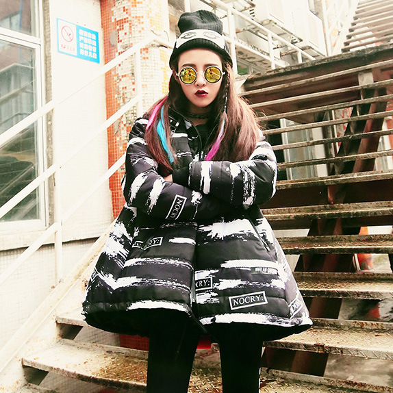 2015新款歐洲站原宿印花連帽加厚A型寬松斗篷棉服大碼棉衣女 /