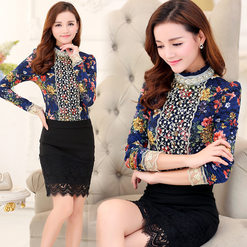 2015秋冬新款加絨女裝蕾絲衫女長袖上衣修身蕾絲衫 /
