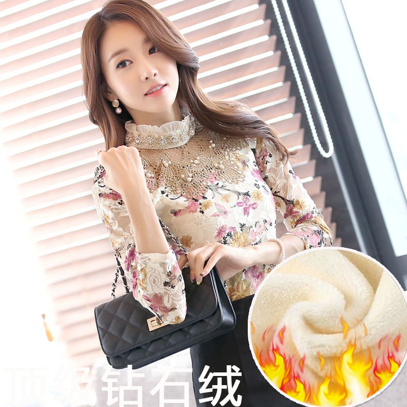 2015秋冬新款韓版修身顯瘦加絨加厚蕾絲打底衫 手工串珠蕾絲衫女 /