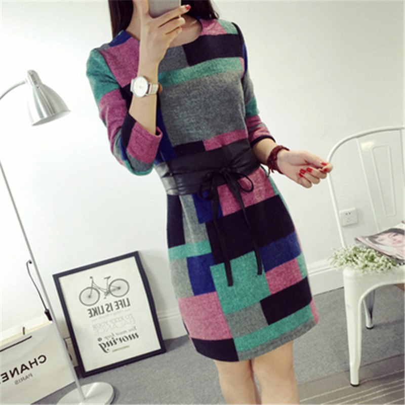 2015冬新款歐洲站女裝長袖格子羊毛連衣裙短裙修身毛呢打底裙 /