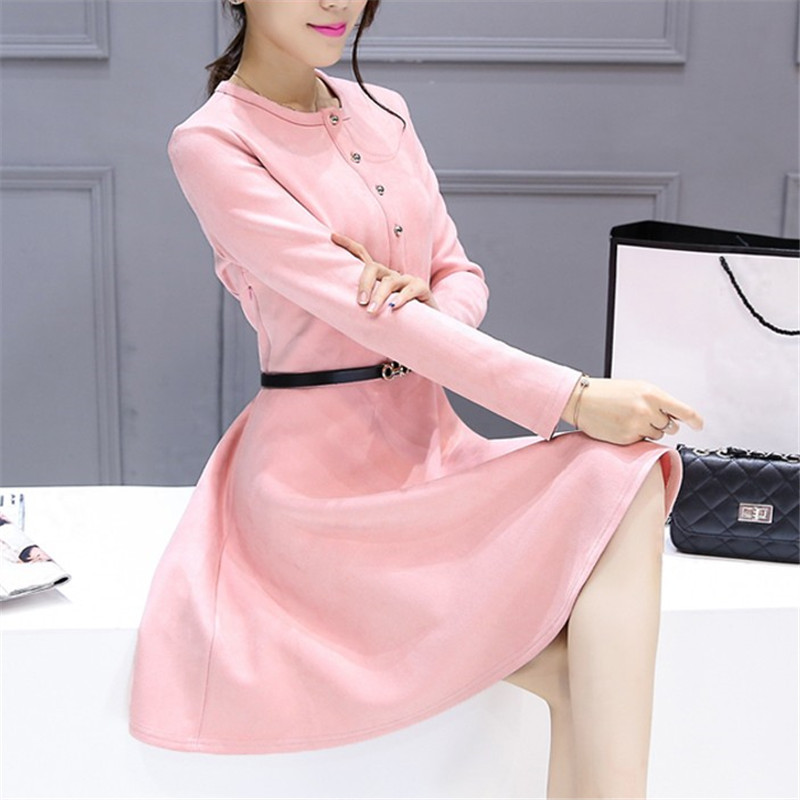 2015秋冬裝新款韓版修身顯瘦高腰粉色麂皮絨中長裙長袖連衣裙女 /