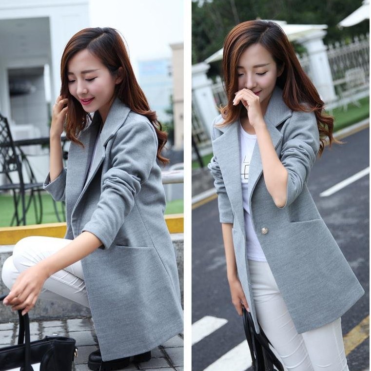 2015秋冬季新款韓版女裝中長款毛呢外套女式西裝領(lǐng)大碼呢子大衣 /