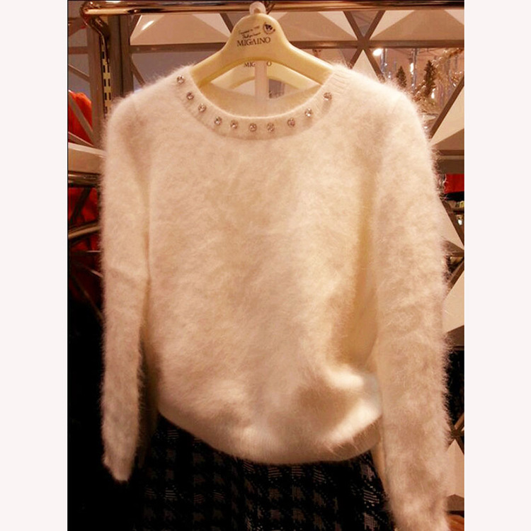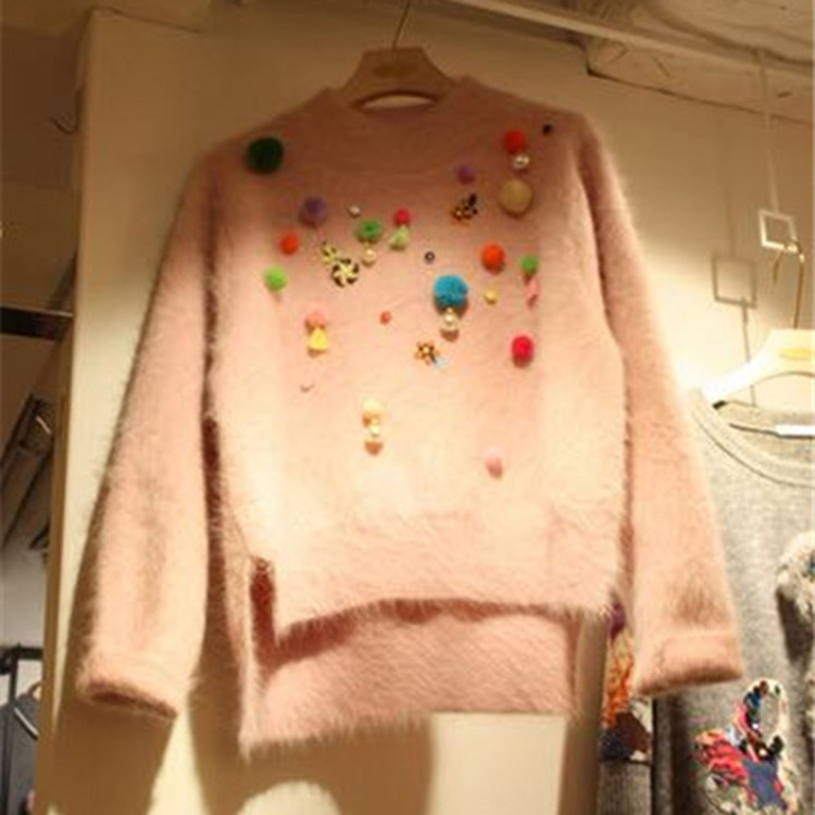韓國代購2015秋新款針織衫韓版女裝長袖寬松加厚圓領(lǐng)釘珠馬海毛衣 /