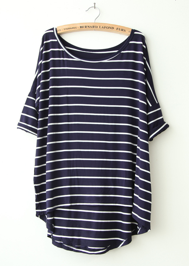 一件代發(fā)莫代爾 柔軟舒服 條紋中袖蝙蝠袖前短后長T恤 TEE /