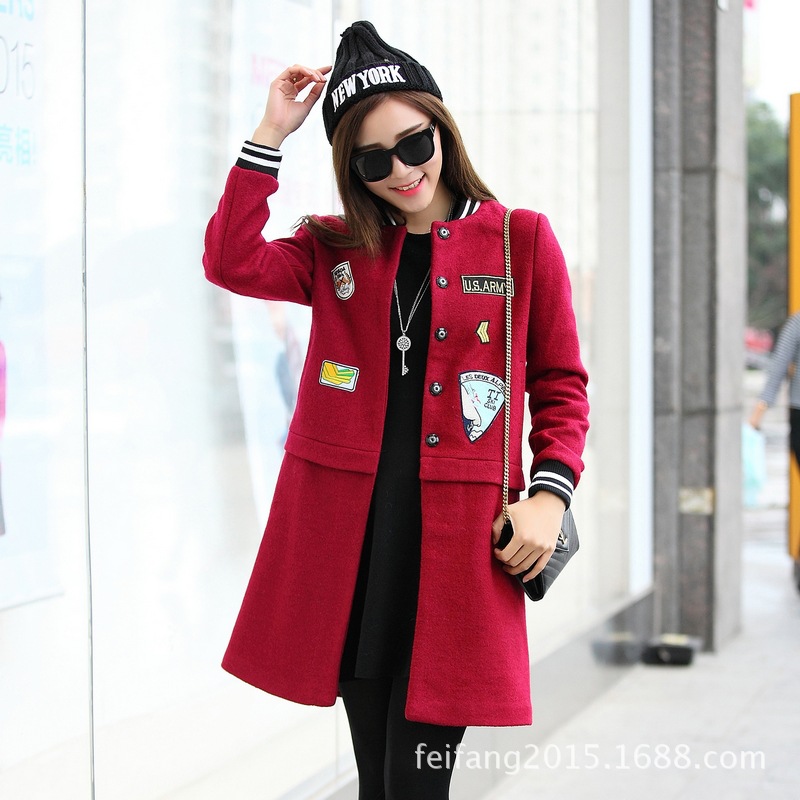 歐洲站2015秋冬裝毛呢外套學(xué)院風(fēng)徽章長款大碼寬松假兩件大衣外套 /