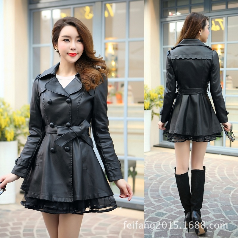 2015早秋新款大碼女裝皮衣外套女士中長款皮風(fēng)衣水洗PU皮大衣外套 /