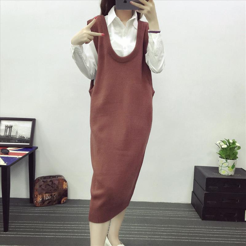 實拍韓版寬松學院風套頭超長款毛衣裙V領無袖背心針織毛線裙 /