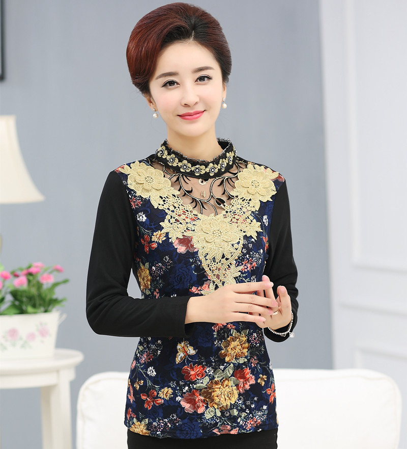 2015秋冬中老年女裝加絨加厚打底衫 媽媽裝長袖T恤大碼蕾絲保暖衣 /