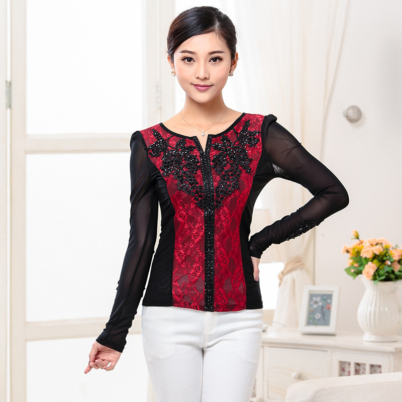 上新款2015秋裝新款長袖修身紅色蕾絲衫打底衫女裝精品上衣t恤潮 /