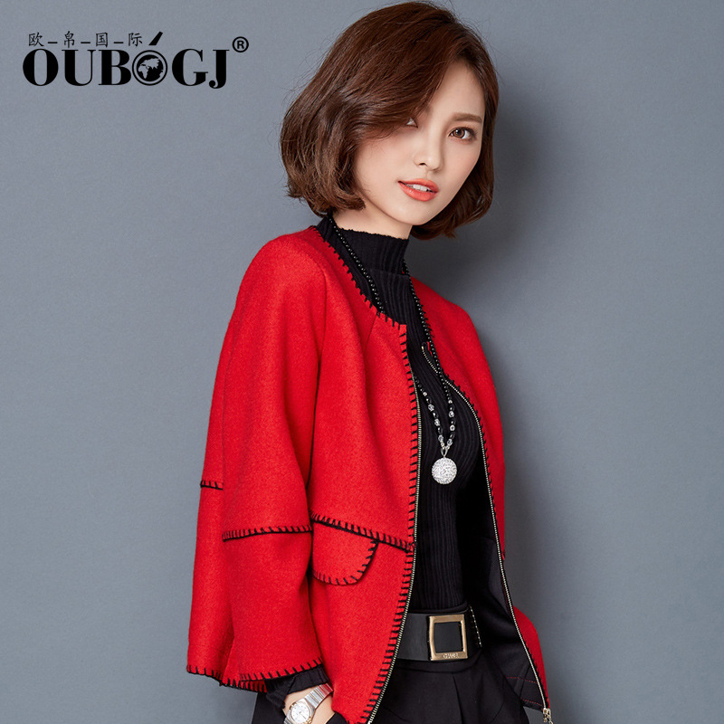 OUBOGJ毛呢外套女短款2015新款秋冬女裝韓版寬松圓領(lǐng)短外套九分袖 /