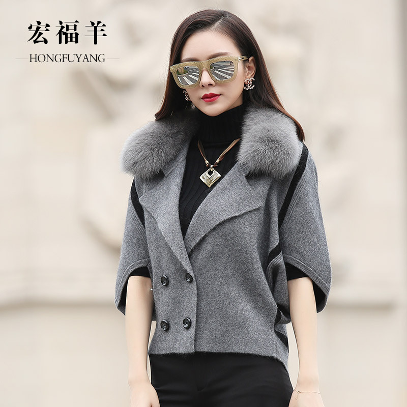 歐洲站2015秋冬毛衣新款女裝狐貍毛領貂絨外套蝙蝠袖貂絨開衫短 /
