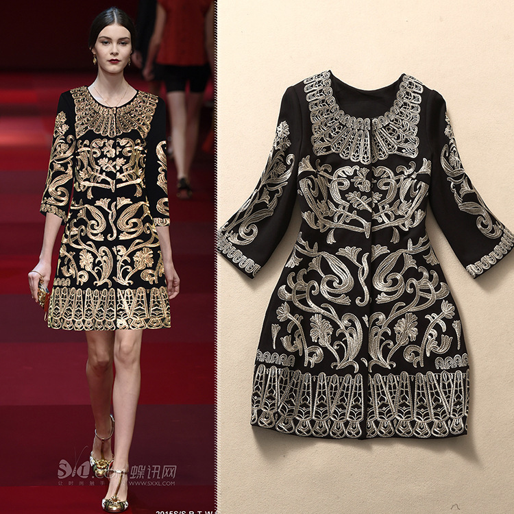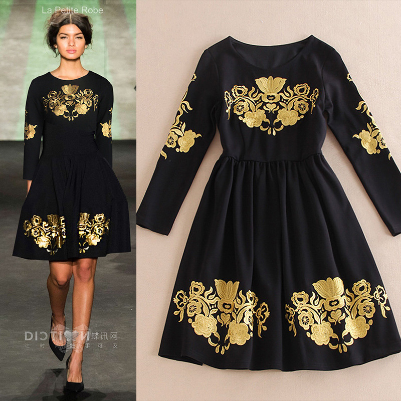 歐美2015秋新款女裝氣質(zhì)百搭收腰修身針織重工刺繡連衣裙 /