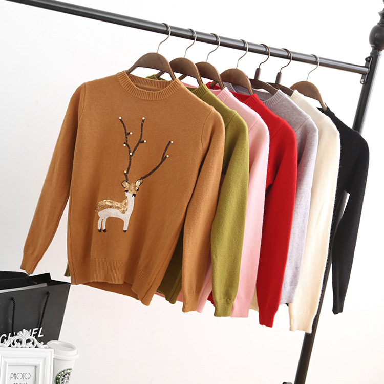 秋季新款 簡約時(shí)尚圓領(lǐng)長袖 韓版女裝珍珠小鹿圖案毛衣 /