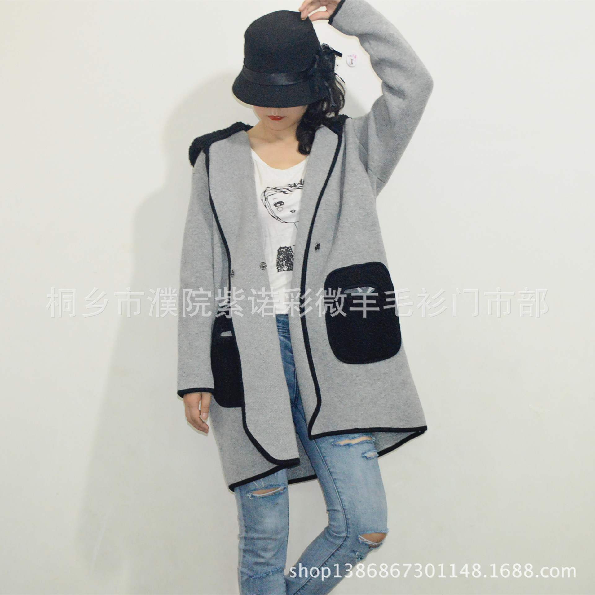 韓國 2015新款拼貼口袋拼接帽子 韓版中長款女裝開衫毛衣厚外套 /