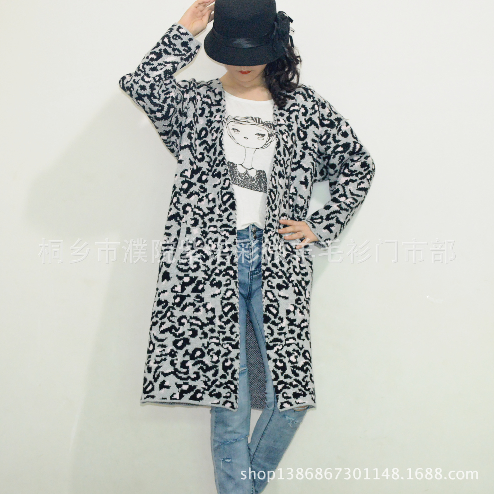 2015秋冬新款高品質(zhì)V領(lǐng)韓版中長款開衫寬松長袖豹紋針織毛衣女 /