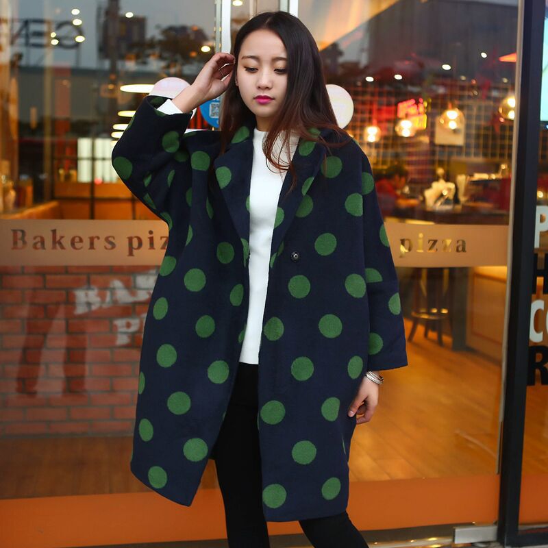 2015冬季新款寬松中長(zhǎng)款毛呢外套廓形羊毛女圓點(diǎn)波點(diǎn)韓版繭型大衣 /