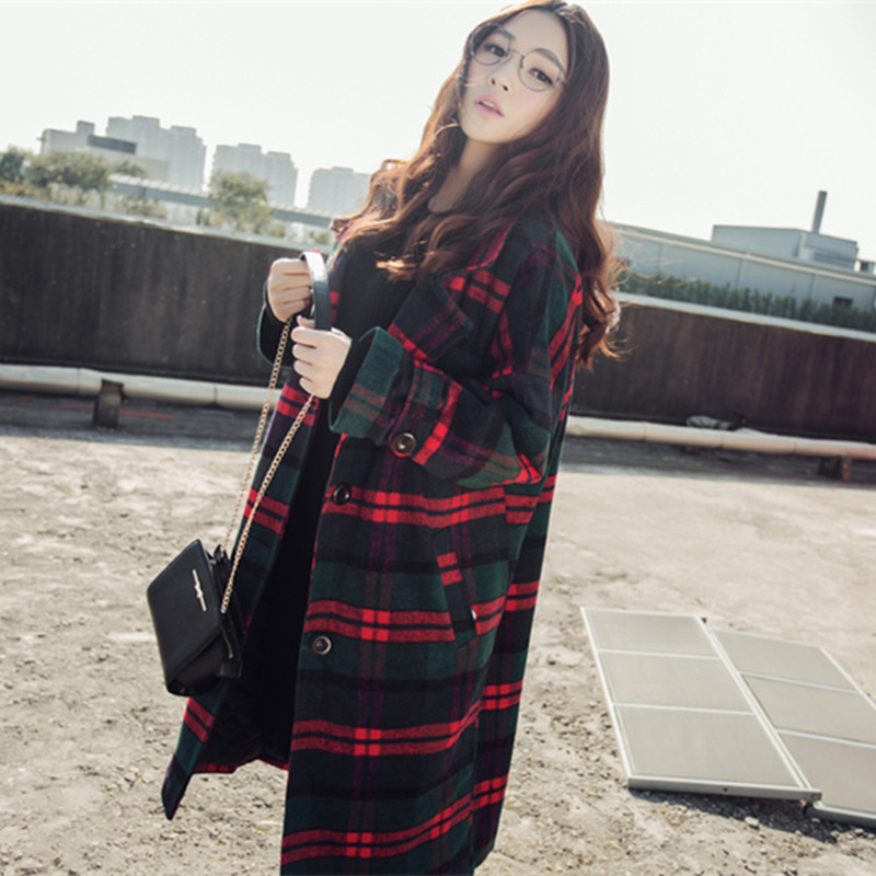 15秋冬新款韓國(guó)東大門中長(zhǎng)款復(fù)古羊毛格子毛呢大衣寬松外套女風(fēng)衣 /