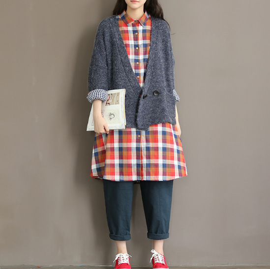 2015新款韓版中長款棉麻長袖大格子襯衫 /
