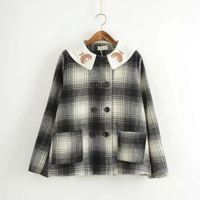 2015新款娃娃領(lǐng)刺繡格子毛呢雙排扣外套 /