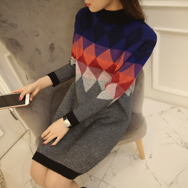 實(shí)拍2015秋冬季新款中長(zhǎng)款格子毛衣毛衣裙 /