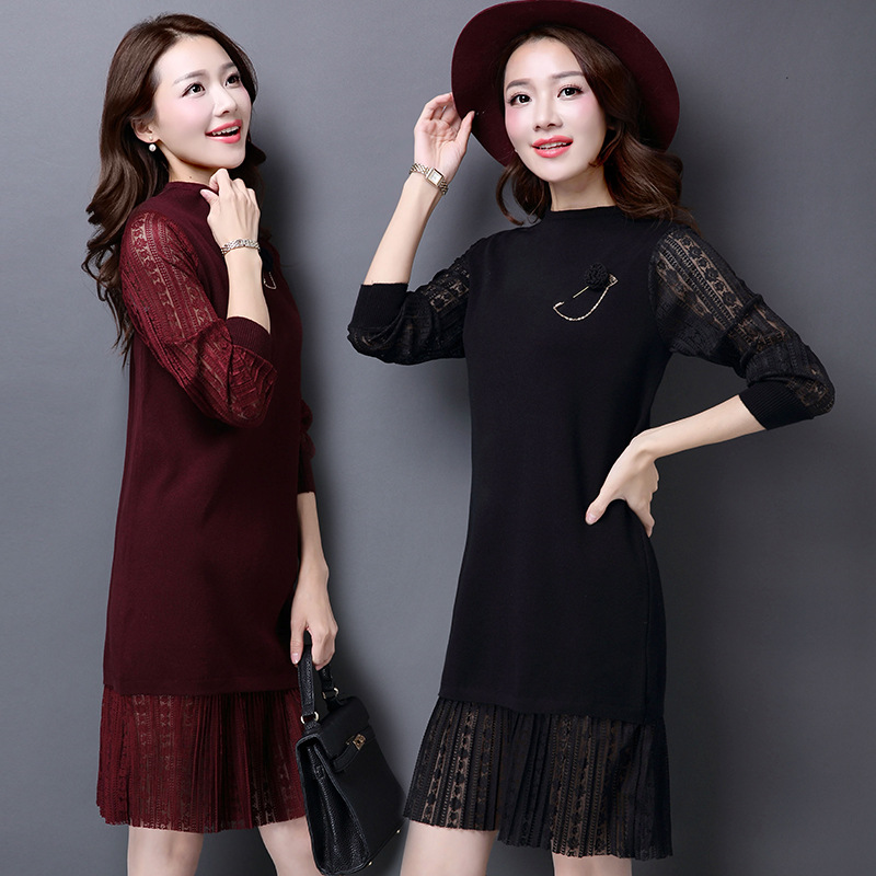 實(shí)拍2015韓版秋冬新款蕾絲袖子針織衫連衣裙 /