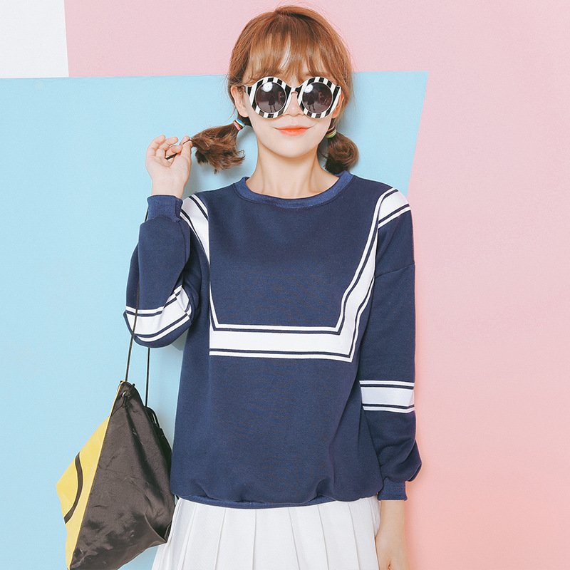 實拍 2015秋冬新款甜美學院海軍風撞色條紋加絨套頭衛(wèi)衣韓版女355 /