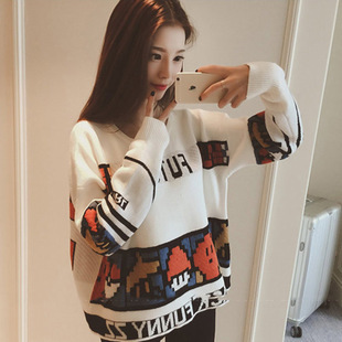 東大門新款提花女式羊毛衫 圓領(lǐng)套頭寬松毛衣女 卡通圖案針織衫 /
