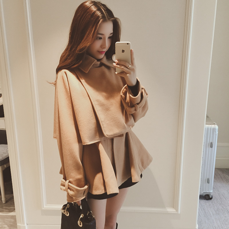 歐美2015冬裝韓國新款純色百搭斗篷無袖毛呢兩件套女 /