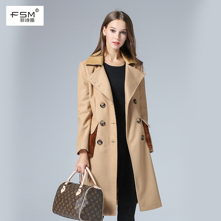 歐洲站毛皮裝飾口袋翻領(lǐng)毛呢大衣 中長寬修身女士風衣外套 /