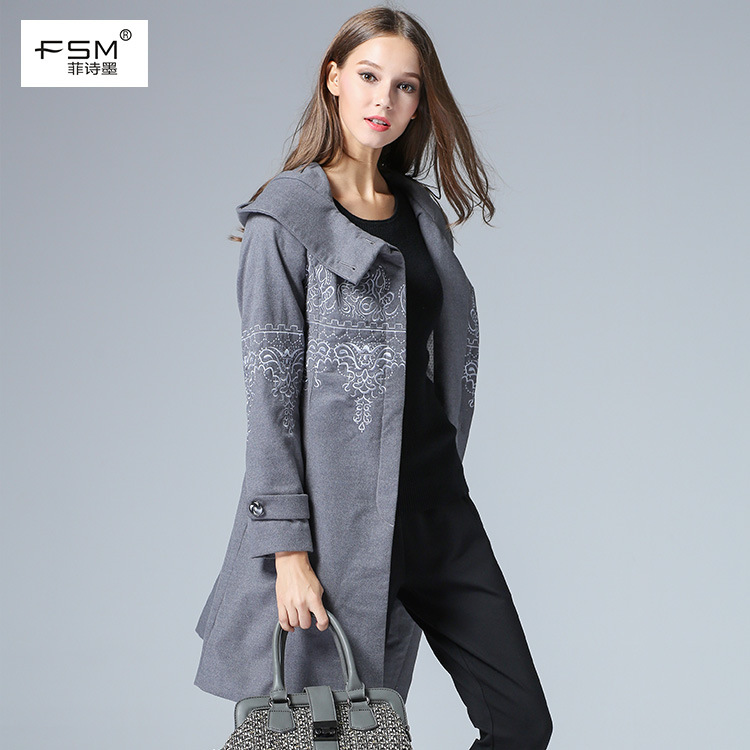 簡介: 貨號QZH15030# 產(chǎn)地深圳 品牌菲詩墨 主圖來源實拍有模特 產(chǎn)品類別風衣 貨源類別訂貨 最快出貨時間1-3天 面料名稱毛呢面料 主面料成分錦綸/尼龍 主面料成分的含量50(%) 圖案繡花精細 風格歐美 厚薄普通 版型裙擺型 衣長中長款(65cm<衣長≤80cm) 領(lǐng)型連帽/帽領(lǐng) 袖長長袖 衣門襟單排扣 是否有腰帶無腰帶 流行元素刺繡
