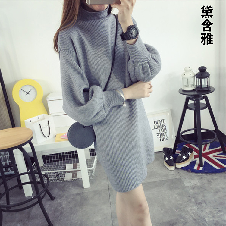 東大門2015秋冬新款泡泡袖半高領(lǐng)中長款套頭羊絨毛衣女打底針織衫 /