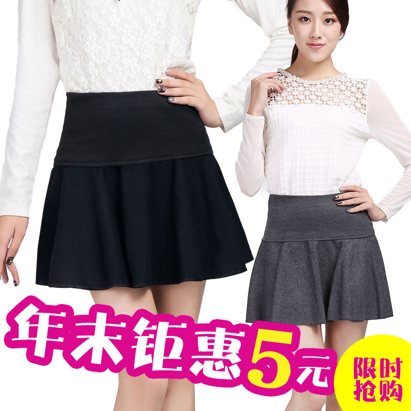 秋冬女裝 韓版高腰羅紋腰圍純色大擺毛呢半身打底短裙 特價清倉 /